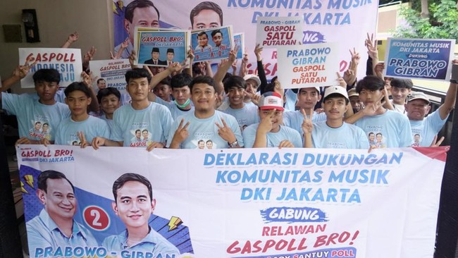 Komunitas Musik Jakarta ikut berkomitmen memenangkan Prabowo Subianto dan Gibran Rakabuming dalam satu putaran. Komunitas Musik Jakarta lantas bergabung bersama relawan Gaspoll Bro.
