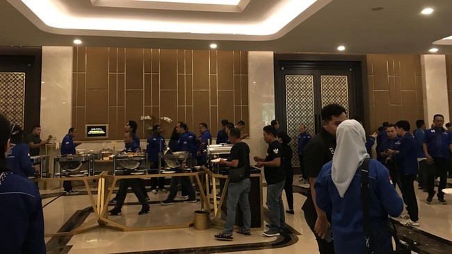 Para kader mengenakan seragam partai lengkap dengan badge jabatan di lengan sebelah kanan. Terlihat pula Sekjen Demokrat Teuku Riefky Harsya di lokasi.