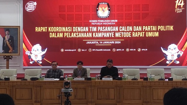 "Hari ini kami bertemu, rapat koordinasi antara KPU kemudian tim paslon dan partai politik peserta pemilu 2024 dalam rangka pembahasan pembagian zonasi kampanye rapat umum. Dan yang kedua untuk kampanye iklan di media massa," kata Komisioner KPU August Melasz di kantor KPU RI, Minggu (14/1/2024).