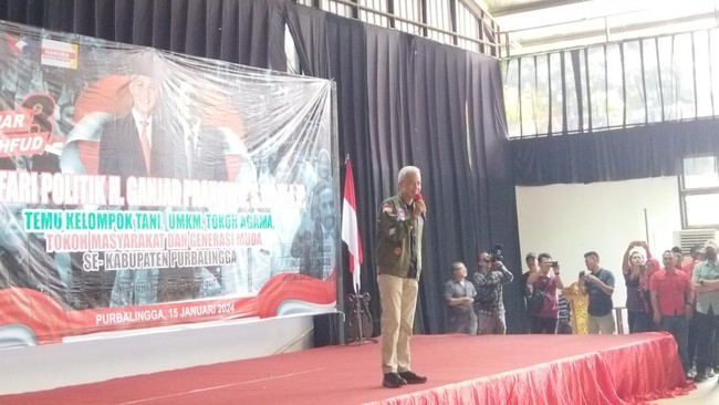 Calon Presiden (Capres) nomor urut 3, Ganjar Pranowo menggelar kampanye di Kabupaten Purbalingga, Jawa Tengah (Jateng). Ganjar ingin memastikan bahwa suara di kampung halaman istrinya, Siti Atikoh, tak diambil.