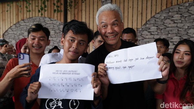 "Hallo, saya Latif. Mohon maaf tuli. Saya nggak bisa dengar omongnya Pak Ganjar," tulis Latif dalam karton yang diperlihatkan kepada Ganjar di Cafe Satu Kata, Purbalingga, Jawa Tengah, Senin (15/1/2024).