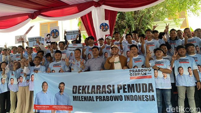Relawan Pemuda Milenial Prabowo Indonesia deklarasi mendukung paslon nomor urut 2 Prabowo Subianto dan Gibran Rakabuming Raka di Pilpres 2024. Deklarasi itu turut dihadiri Wakil Ketua Tim Kampanye Nasional (TKN) Prabowo Subianto-Gibran Rakabuming Raka Juri Ardiantoro dan Wakil Komandan TKN Pemilih Muda (Fanta) Prabowo-Gibran, Osco Olfriady.