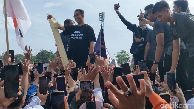 Pantauan detikcom di Lapangan Batako Pinang, Kota Tangerang, Banten, Anies tiba di lokasi pukul 08.20 WIB, Minggu (21/1/2024). Terdengar simpatisan berteriak 'Anies Presiden'.
