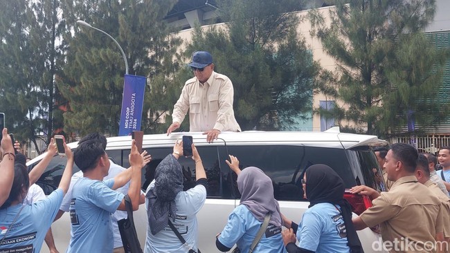 Capres nomor urut 02 ini disambut warga yang sudah menunggu di sekitar lapangan panahan di luar lokasi acara. Mereka berebut agar bisa bersalaman dan berfoto dengan Prabowo.