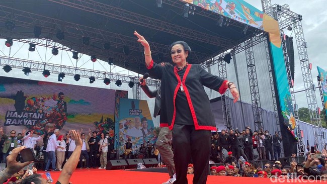Ketum PDIP Megawati Soekarnoputri dan Ketua DPP PDIP Puan Maharani menemani capres nomor urut 3 Ganjar Pranowo dalam kampanye akbar hari pertama. Megawati sempat berjoget bareng Slank saat menghadiri kampanye itu.