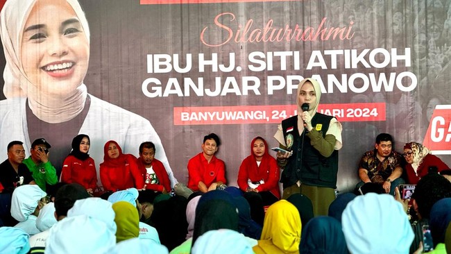 Pantauan detikcom di lokasi, Rabu (24/1/2024), Atikoh disambut oleh Bupati Banyuwangi Ipuk Fiestiandani. Para karyawan dan warga yang tinggal di sekitar pabrik juga menyambut kedatangan Atikoh.
