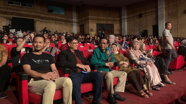 Sejumlah penonton juga tampak meminta foto dengan Mahfud. Mereka menghampiri kursi duduk Mahfud untuk meminta foto bersama.