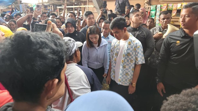 Pantauan detikcom dilokasi, Jumat (26/1/2024), Gibran mengunjungi pasar Pharaa Sentani ditemani istrinya Selvi Ananda. Gibran juga sesekali menyapa warga dan para pedagang di pasar.