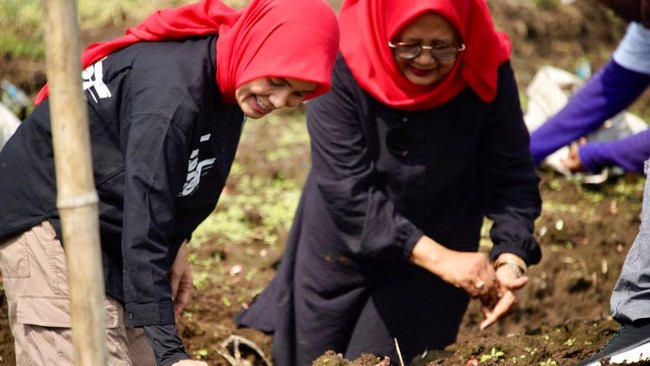 Istri capres nomor urut 3 Ganjar Pranowo, Siti Atikoh Supriyanti menyambangi Dusun Wonosalam, Kabupaten Probolinggo, Jawa Timur. Di sana Atikoh bertemu petani bawang dan ikut menanam.