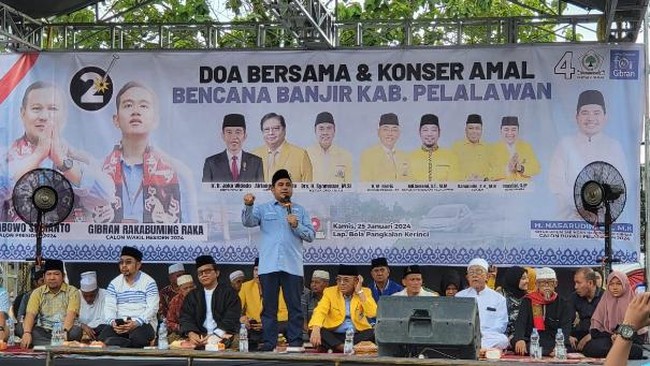 Relawan Jaringan Nasional (Jarnas) For Gibran menggelar doa bersama dan konser amal di Kabupaten Pelalawan. Acara ini disebut untuk membantu warga yang sebelumnya terdampak banjir.