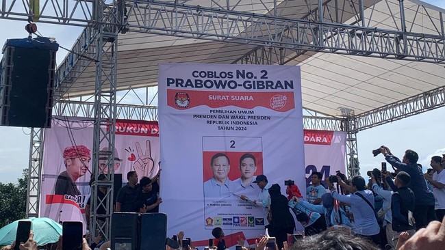 Pantauan detikcom di lokasi, Sabtu (27/1/2024), surat suara raksasa bergambar wajah Prabowo-Gibran tampak dinaikkan ke atas panggung. Politikus Maruarar Sirait atau Ara meminta Prabowo memilih emak-emak sebagai perwakilan untuk melakukan simulasi pencoblosan.
