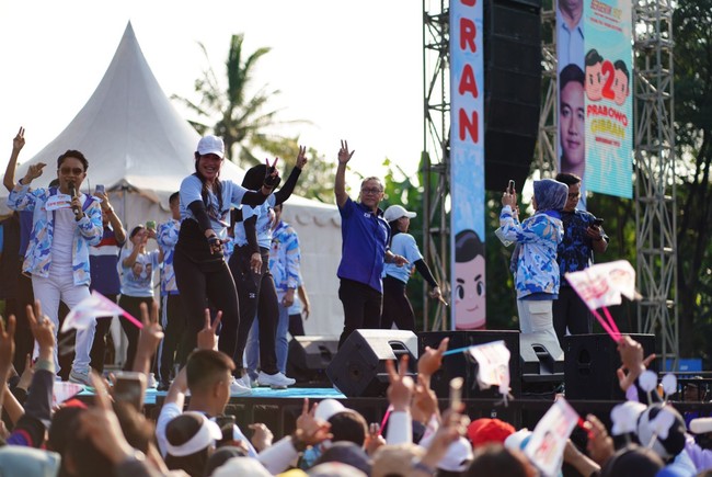 "Kita namanya pesta (demokrasi), kita bergembira. Oleh karena itu, kampanye kita gembira, kita hiburan, kita sambut Pemilu kita agar damai,. Prabowo-Gibran menang sekali putaran," imbuh Zulhas.