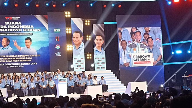 "Boleh saya bertanya ke anak muda hari ini? Ada yang ngerti greenflation nggak? Ada yang ngerti SGIE nggak? Yang mau jawab saya kasih jaket saya. Coba MC pilih salah satu. Greenflation, SGIE. Saya kasih jaket yang kita pakai waktu debat," kata Gibran di JCC Senayan, Jakarta pada Sabtu (27/1/2024).