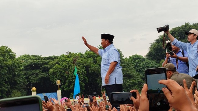 Kehadiran Prabowo yang sudah ditunggu sejak siang tadi oleh para pendukung disambut dengan teriakan. Warga terlihat mengacungkan tangan dua jari sambil bernyanyi 'Oke Gas;.