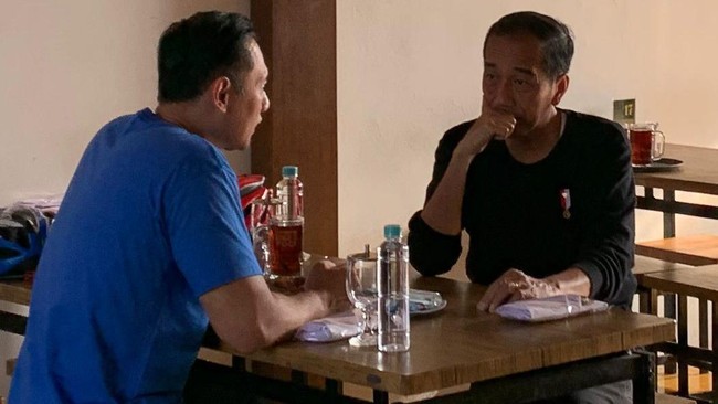 Dari foto yang diterima detikcom, terlihat Jokowi dan AHY duduk saling berhadapan. Jokowi tampak mengenakan kaus hitam berlengan panjang dan AHY mengenakan kaus lengan pendek berwarna biru.