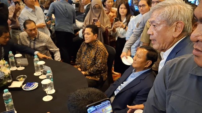 Capres nomor urut 2 Prabowo Subianto menghadiri acara yang digelar oleh Trimegah Sekuritas di Pacific Place, Jakarta, hari ini. Menteri BUMN Erick Thohir dan eks Menteri Perdagangan (Mendag) M Lutfi ikut hadir satu meja dengan Prabowo.