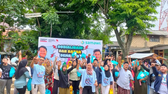 Relawan Solidaritas Ulama Muda Jokowi (Samawi) menggelar bazar sembako murah di Kota Tangerang, Banten. Selain itu, mereka pun mensosialisasikan visi dan misi dari pasangan calon presiden (capres) nomor urut 2 Prabowo Subianto-Gibran Rakabuming Raka.