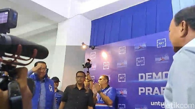 Prabowo tampak mengenakan kemeja berwarna biru muda. Prabowo kemudian dipakaikan rompi Partai Demokrat berwarna biru bertuliskan 'Demokrat S14P'.