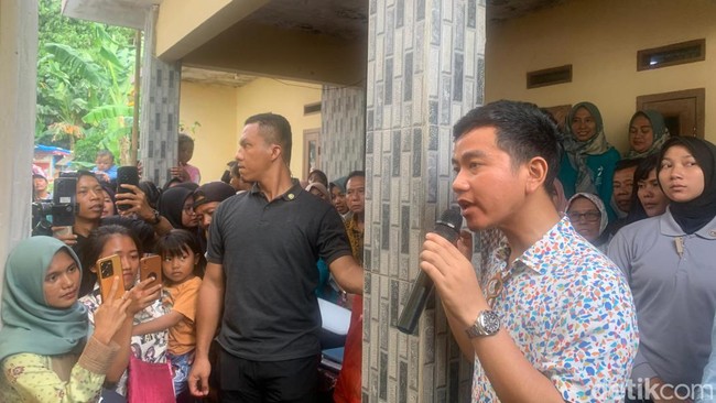 "Hati-hati ya bu nanti, jalannya agak licin ya. Ini nanti saya mau bagi makanan ya bu, ibu-ibu pokoknya sehat terus, anak-anaknya dijaga biar sehat semua," kata Gibran.