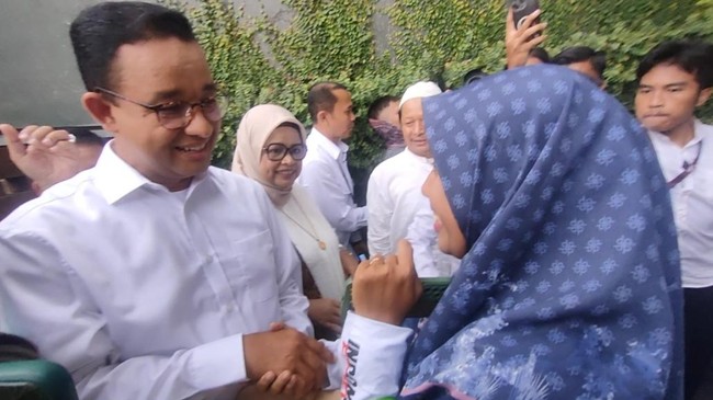 Anies juga menghampiri salah satu tetangga di depan rumah. Seorang ibu mengenakan daster menyalami capres nomor urut 1 ini.