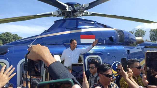 Pantauan detikcom di Lapangan Bola Nunuk Matali, Senin (5/2/2024), Anies tiba di Kotamobagu menggunakan helikopter NasDem PK-RJS. Anies mengenakan kemeja putih.