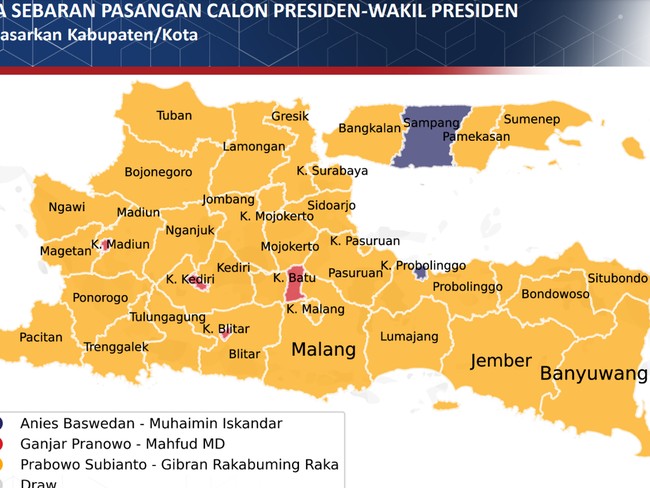 "Sementara Ganjar masih potensi unggul di empat kabupaten terutama di tiga kabupaten Matraman dan itu memang basisnya PDIP. Jadi Ganjar diproyeksi akan unggul di tiga kota Jawa Timur yaitu Kota Madiun, Kediri, dan Kota Batu. Sementara Anies Baswedan di 2 kabupaten yaitu di Kabupaten Sampang dan di Probolinggo," imbuhnya.