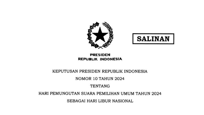 Seperti dilihat detikcom melalui salinan yang dilansir Kemensetneg, Keppres No. 10 Tahun 2024 tentang Hari Pemungutan Suara Pemilihan Umum Tahun 2024 Sebagai Hari Libur Nasional itu ditetapkan Jokowi pada 6 Februari 2024.
