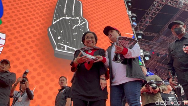 Didampingi Puan, Megawati pun membagikan kaus kepada para peserta yang hadir dalam Hajatan Rakyat tersebut. Para pendukung tampak antusias menerima kaos dari Megawati.