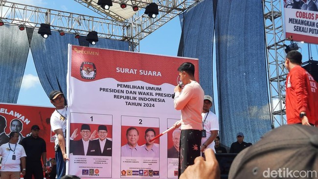 Kampanye akbar itu digelar di Lokajaya Stadium, Tuban, Jawa Timur, Jumat (9/2/2024). Kaesang memperagakan cara mencoblos menggunakan tongkat besar dan surat suara raksasa. Dia mengatakan agar warga Tuban mencoblos paslon nomor urut 2.