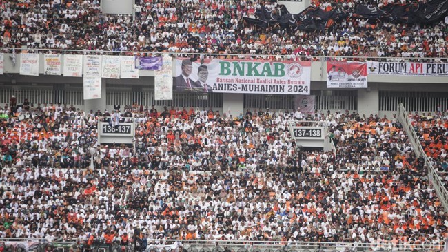 Pasangan calon nomor urut 1 Anies Baswedan-Muhaimin Iskandar (AMIN) menggelar kampanye akbar di Jakarta Internasional Stadium (JIS). Massa pendukung AMIN tampak memenuhi dalam JIS.