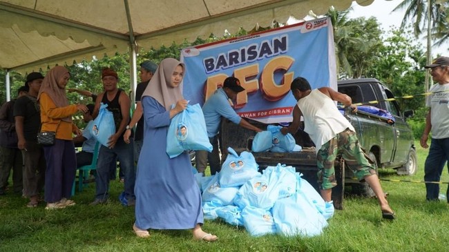 Relawan Gibran Rakabuming Raka yang tergabung dalam Barisan Relawan For Gibran (Barisan RFG) bersama Komunitas Tani di Konawe menggelar tebus murah 1.000 paket sembako dan 3.000 porsi makan siang gratis yang diborong dari dagangan UMKM lokal di lokasi ketujuh di Kabupaten Konawe, Sulawesi Tenggara.