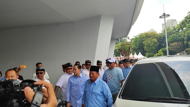 Dia batang menumpangi mobil Alpard putih beserta iring-iringannya. Prabowo tampak mengenakan kemeja lengan panjang berwarna biru lengkap dengan peci hitam.