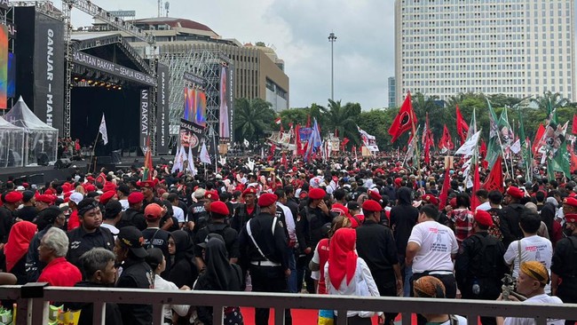 Pantauan detikcom di lokasi, Sabtu (10/2/2024), pukul 13.30 WIB, terlihat massa pendukung memenuhi Lapangan Pancasila Simpang Lima, Semarang, Jawa Tengah. Massa pendukung terlihat mengenakan baju berwarna merah dan hitam.