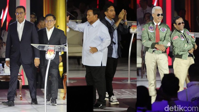 Sementara paslon nomor urut 1 Anies Baswedan dan Muhaimin Iskandar (Cak Imin) berada di posisi kedua. Di urutan buncit ialah paslon nomor urut 3 Ganjar Pranowo dan Mahfud MD. Berikut rangkumannya: