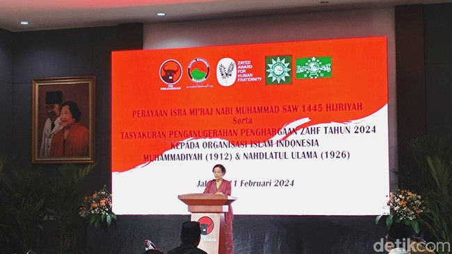 Ketua Umum PDI Perjuangan Megawati Soekarnoputri berbicara soal seragam majelis Taklim ibu-ibu dalam acara Isra Mi'raj di Masjid At-Taufiq, Lenteng Agung, Jakarta Selatan. Mulanya, dia mengatakan bahwa seharusnya masyarakat miskin itu diperhatikan.