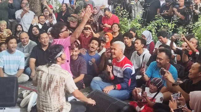 Capres nomor urut 3, Ganjar Pranowo, nonton bareng Slank di Taman Budaya, Semarang. Di tengah penampilan Slank, Ganjar diminta membeberkan impiannya untuk Indonesia.