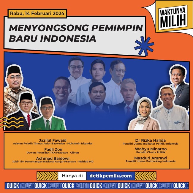 detikcom menghadirkan diskusi 'Menyongsong Pemimpin Baru Indonesia' pada Rabu, 14 Februari 2024 pukul 12.00-15.00 WIB. Acara ini akan disiarkan secara live streaming di detikcom.