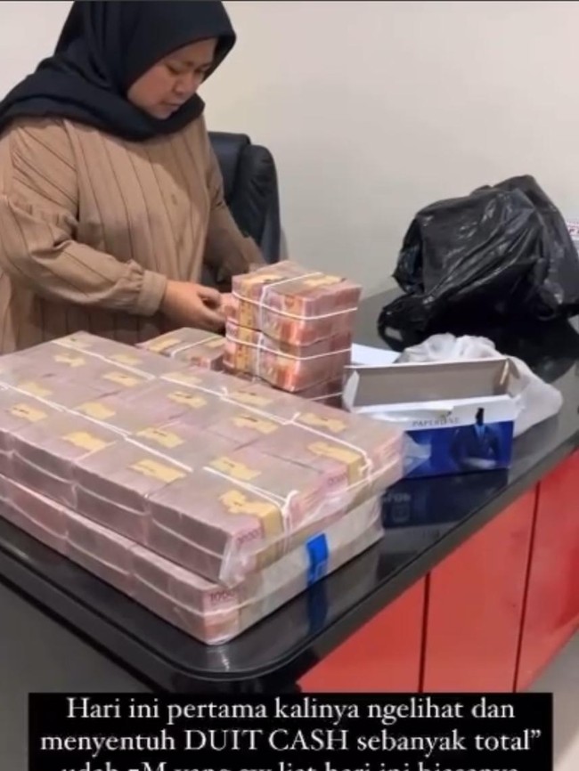 Di dalam video itu, ada juga narasi yang ditambahkan. Tulisannya "Hari ini pertama kalinya ngelihat dan menyentuh DUIT CASH sebanyak total" udah 7M yang gw liat hari ini biasanya cuma liat dalem bentuk saldo doang".