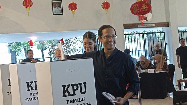 Pantauan detikcom di lokasi, Rabu (14/2/2023), Nadiem bersama istrinya, Franka Franklin menuju bilik sambil membawa kertas suara. Sementara ketiga anaknya menunggu di kursi tunggu.