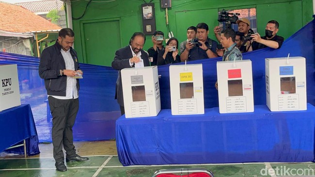 Setibanya di TPS, keduannya melakulan resgitrasi lebih dulu. Tak lama, nama Surya Paloh dipanggil oleh panitia untuk mengambil surat suara dan mencoblos di bilik yang tersedia.