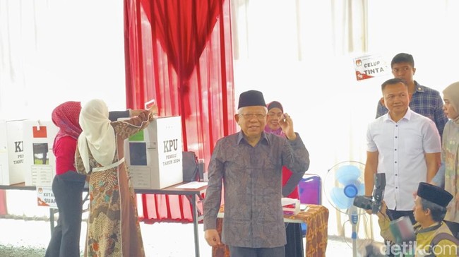 Pantauan detikcom di lokasi, Rabu (14/2/2024), pukul 09.15 WIB terlihat Ma'ruf mengenakan baju batik bercorak. Tampak Ma'ruf didampingi istrinya, Wury Estu.
