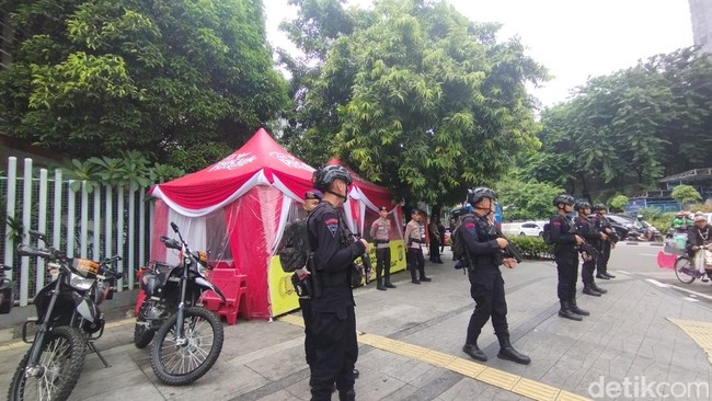 Pantauan detikcom di kantor Bawaslu RI, Jalan MH Thamrin, Menteng, Jakarta Pusat, Rabu, (13/2/2024), terdapat beberapa personel Brimob dan Sabhara yang disiagakan.