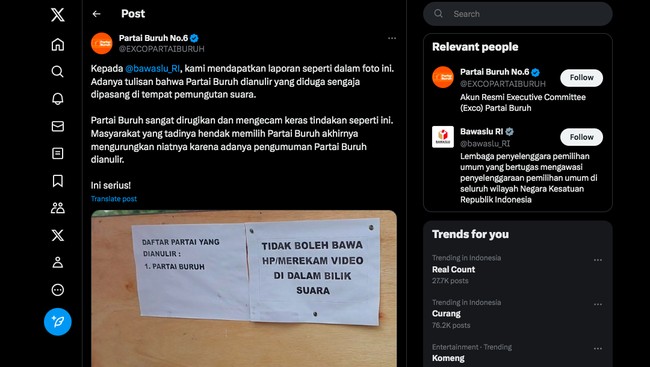 "Kepada @bawaslu_RI, kami mendapatkan laporan seperti dalam foto ini. Adanya tulisan bahwa Partai Buruh dianulir yang diduga sengaja dipasang di tempat pemungutan suara," tulisnya.