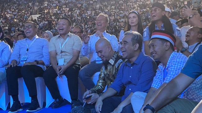 Sementara, di depan mereka terlihat Muzani, Ahmad Dhani, dan Komandan Tim Kampanye Nasional (TKN) Fanta Arief Rosyid yang justru memilih duduk lesehan. Mereka tampak menyimak penyampaian dari Prabowo.