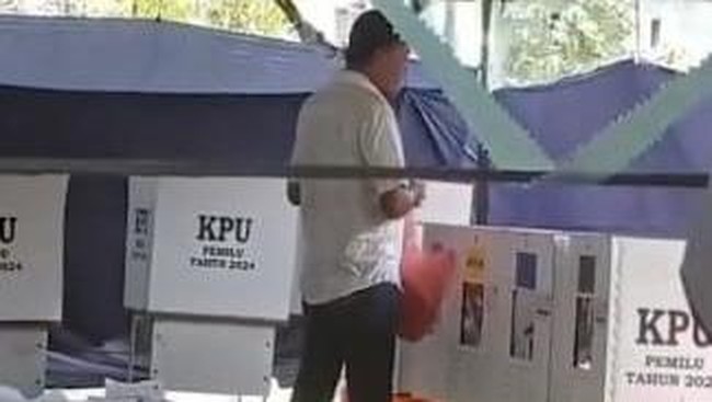 Pria itu memegang kantong plastik dengan tangan kiri dan memasukkan ke kotak suara menggunakan tangan kanan. Beberapa orang tampak berada di lokasi saat pria tersebut memasukkan surat suara ke kotak suara.