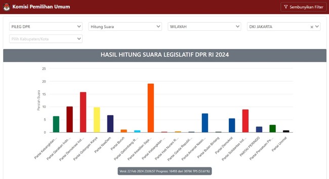 Dilihat detikcom di situs pemilu2024.kpu.go.id, Jumat (23/2/2024), total data yang masuk berasal dari 16.493 TPS atau 53,61% dari total 30.766 TPS di Jakarta. Data tersebut diperbarui pada pukul 23.06 WIB, Kamis (22/2).