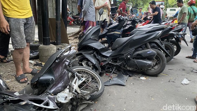 Sebuah ambulans dengan logo Partai Demokrat menabrak 5 motor pengunjung warkop yang terparkir di pinggir Jalan Simokerto, Surabaya, Jawa Timur. DPC Partai Demokrat Surabaya bukan suara.