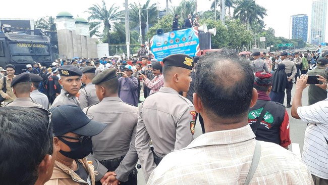 Pantauan detikcom di lokasi pukul 14.30 WIB, massa mulai memadati ruas Jalan Gatot Subroto, Jakarta Pusat. Arus lalu lintas menuju ke Slipi tersendat.