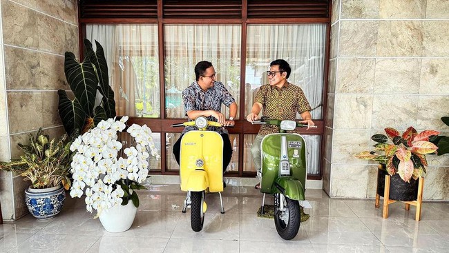 Pasangan nomor urut 1 Pilpres 2024 Anies Baswedan-Muhaimin Iskandar atau Cak Imin bertemu. Anies-Cak Imin kompak naik sepeda motor Vespa.