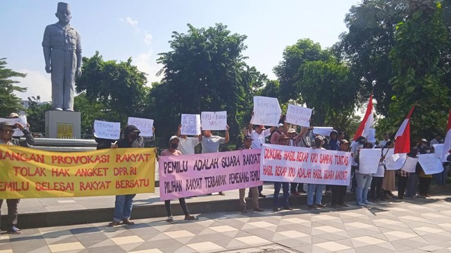 "Hari ini kita hanya menyampaikan aksi damai saja. Hari ini yang mendukung hasil rekap KPU adalah sah," kata Koordinator Aksi Pemilu Damai dari Aliansi Peduli Pemilu Jatim, Bayu Aluning S, dalam keterangan yang diterima, Selasa (19/3/2024).